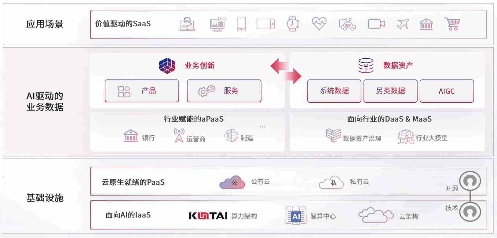 数字时代,,,围绕企业数字化转型的关键要素,,bob波币钱包数码开创性的提出数云融合战略和技术体系框架,,,着力在云原生、、、、数字原生、、AI原生和信创产业上架构产品和服务能力,,,为处在不同数字化转型阶段的快消零售、、、、汽车、、、、金融、、、、医疗、、、政企、、、、教育、、、运营商等行业客户提供泛在的敏捷IT能力和融合的数据驱动能力,,,构建跨界融合创新的数字业务场景和新业务模式,,助力企业级客户建立面向未来的核心能力和竞争优势,,,全面推动社会的数字化、、、智能化转型升级。。